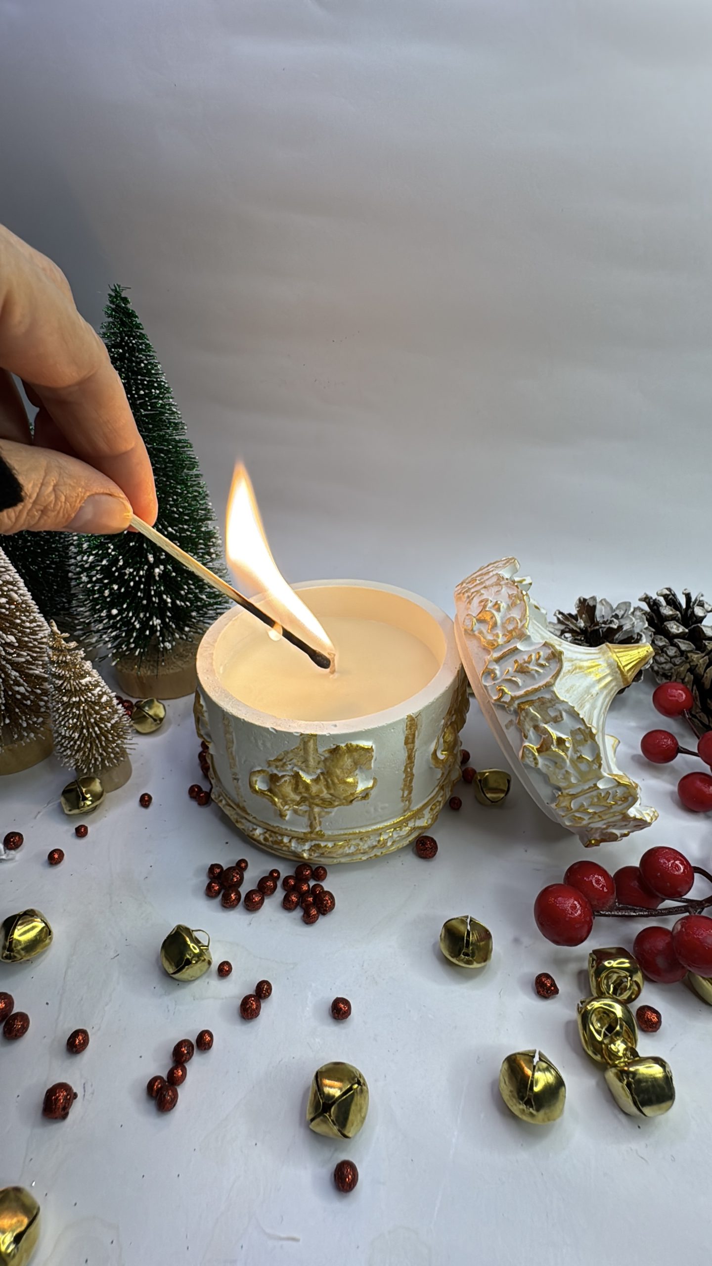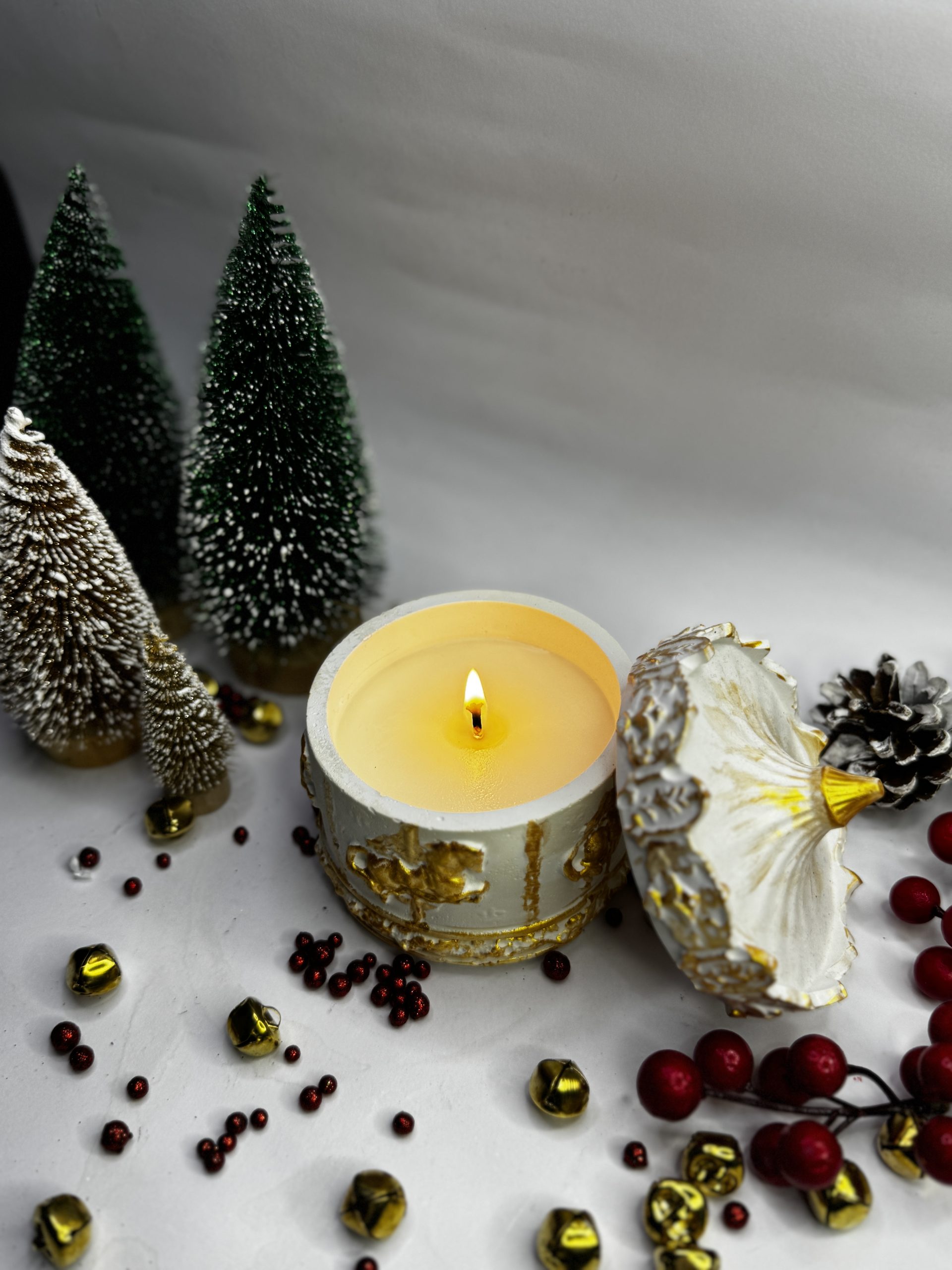 Ένα μοναδικό, χειροποίητο δοχείο από σκόνη πορσελάνης, διακοσμημένο με εκλεπτυσμένες χρυσές λεπτομέρειες. Στο εσωτερικό του φιλοξενεί αρωματικό κερί υψηλής ποιότητας, που χαρίζει ζεστασιά και ατμοσφαιρικό φως στον χώρο σας.