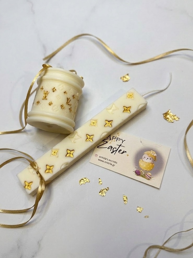 • Αρωματική Λαμπάδα: Μια minimal, τετράγωνη λαμπάδα σε κρεμ απόχρωση, διακοσμημένη με τα χαρακτηριστικά χρυσά μοτίβα του οίκου και πολυτελή χρυσή κορδέλα.